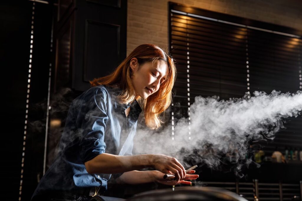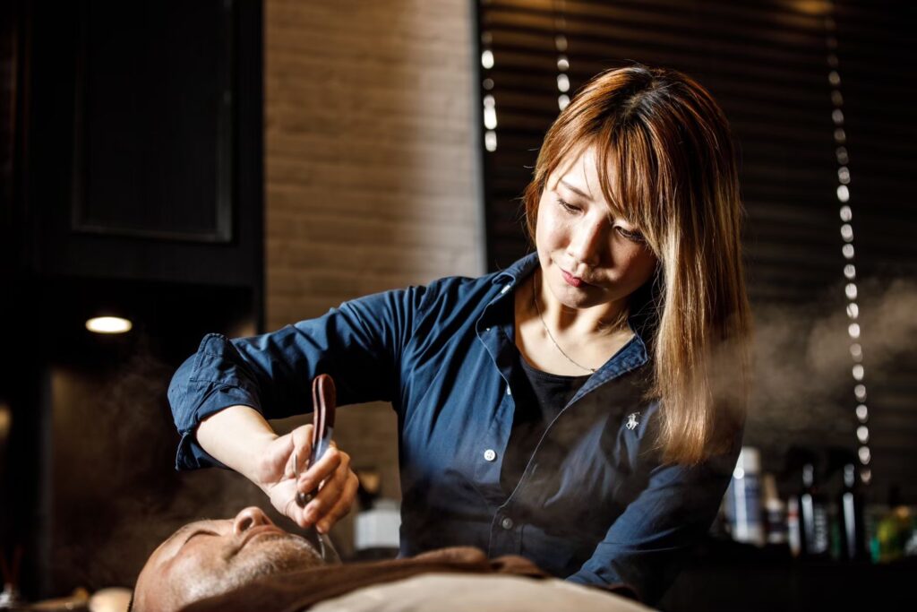 HIRO THE BARBERのシェービングは、香りの良い石けんで泡を作り、あたたかいタオルで顔を包むことから始まります。