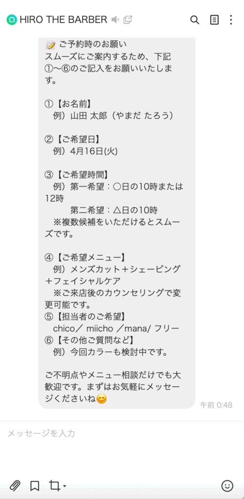 「お名前・ご希望日時・ご希望メニュー」を添えてお送りいただければスムーズにご案内できます。